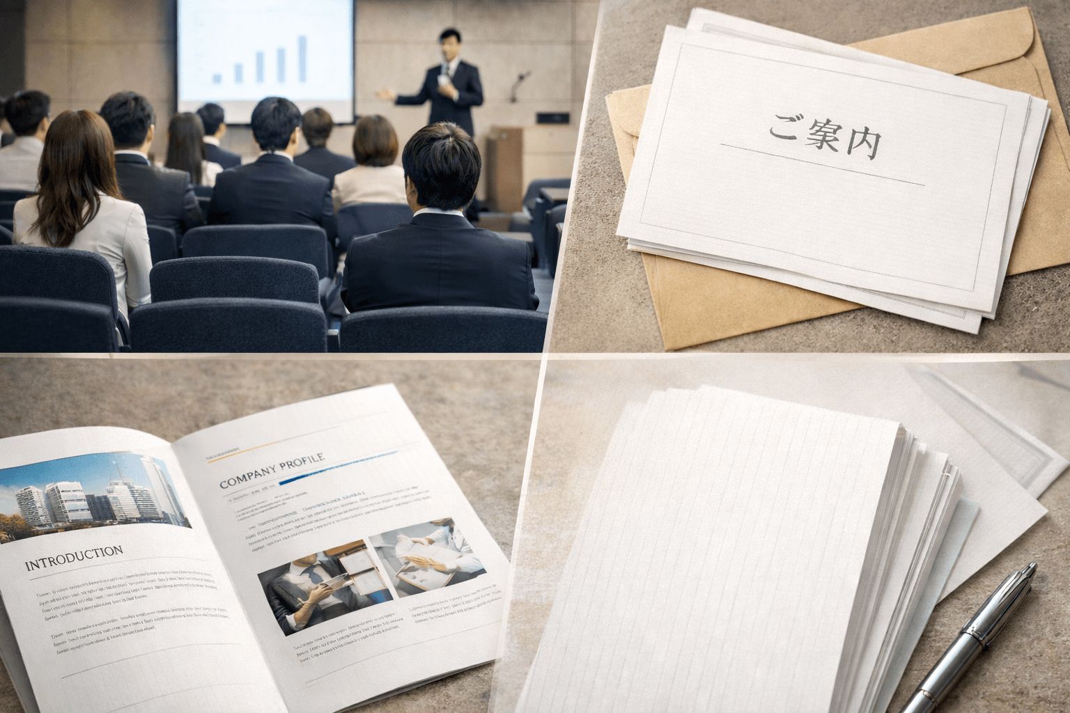 企業説明会の案内状、受付で手渡される配布資料、社内外に配られる各種案内物。