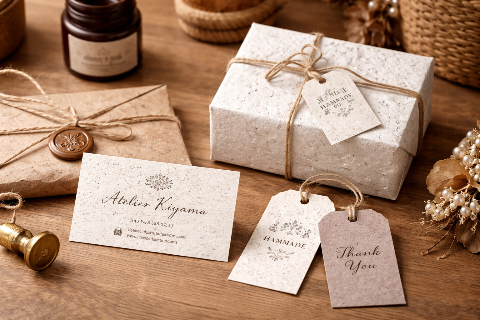 また、和紙のような自然な風合いも併せ持ち、和風・ナチュラル・クラフトテイストとの相性も抜群。パッケージやカード、タグなど、手に取るシーンでこそ、その価値がより強く伝わる紙です。