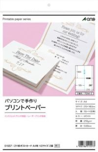 ●いろいろなプリンタで印刷できるタイプのプリントペーパーです。●ミシン目加工や折り加工が入っているため、簡単に切り離し、折り曲げが出来ます。●招待状や案内状に便利なA4判1/2サイズ2ツ折カードです。シートサイズ A4判 (210×297mm)一片サイズ 210mm×148.5mm面付 2面 1列×2段用紙特性 マット 白マット紙標準総厚み 210g/平米(0.23mm)ラベル・カード厚み 0.23mm入り数 10シート(20枚)