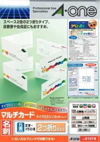 両面印刷対応の名刺シート 自作名刺に便利 エーワン マルチカード 名刺用紙 プリンタ兼用 両面 マイクロミシン 2つ折りタイプ 5面 100シート 51078