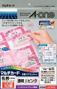 インクジェット専用名刺用紙 鮮明印刷に最適 エーワン マルチカード 名刺用紙 クリアエッジ 10面 透明 ピンク ツヤ消しフィルム 3シート 51643