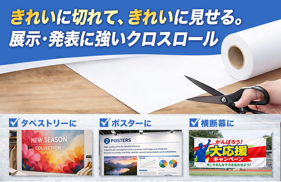 染料・顔料インクに対応し、細線表現も美しく再現できるため、短期掲示用のタペストリーやポスターに適しています。はさみやカッターで手軽にカットでき、ほつれがほとんど出ないのが特長です。シワや折れが目立ちにくく、学会発表や展示用途でも安心してお使いいただけます。