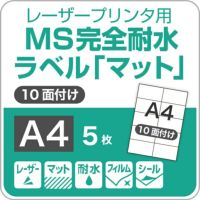 MS完全耐水ラベル「マット」A4サイズ(10面付):5枚 レーザープリンター用 耐水性 マット調 PETフィルム 商品ラベル 屋外用ポスター 薬品ラベル 瓶ラベル ドラム缶ラベル